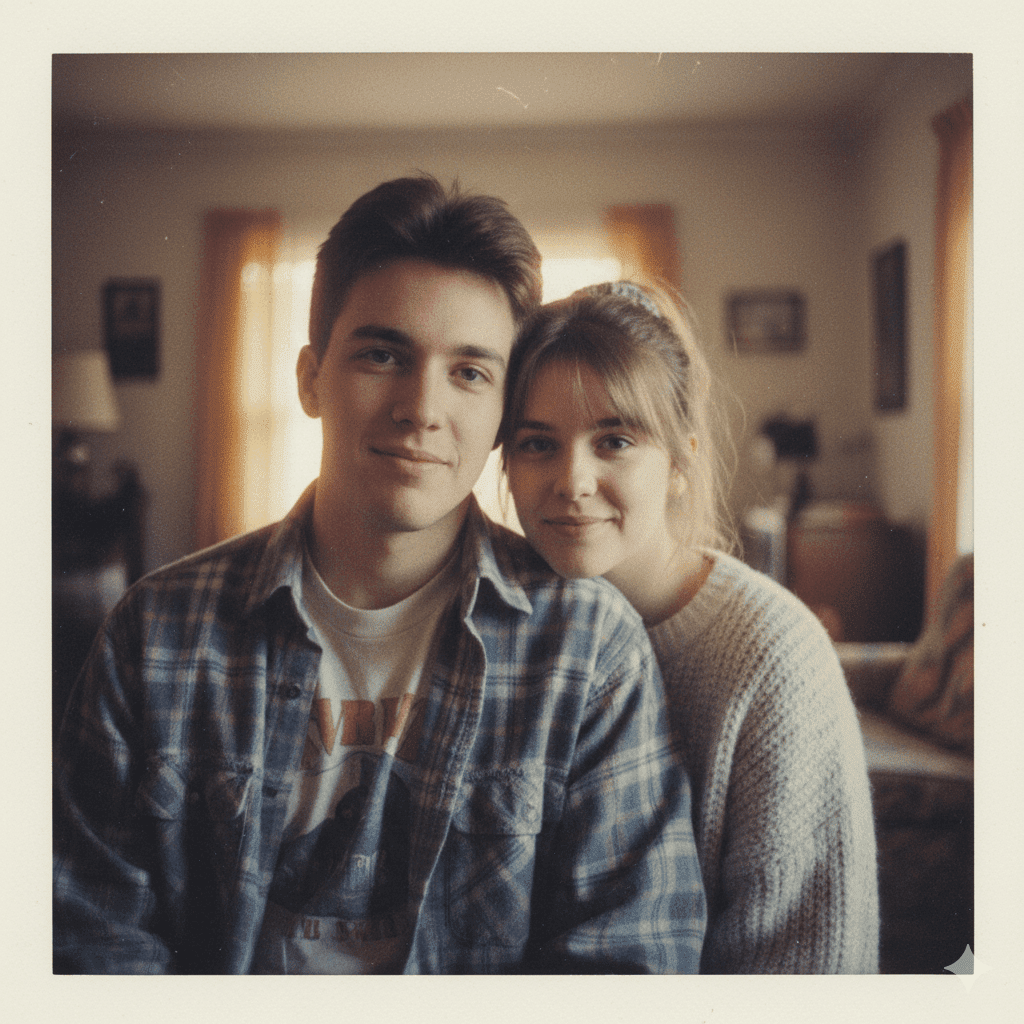 A couple in a close-up retro portrait, soft-focus edges, Polaroid-inspired lighting, grainy pastel tones, nostalgic warm highlights, natural emotion, 1990s film portrait style.