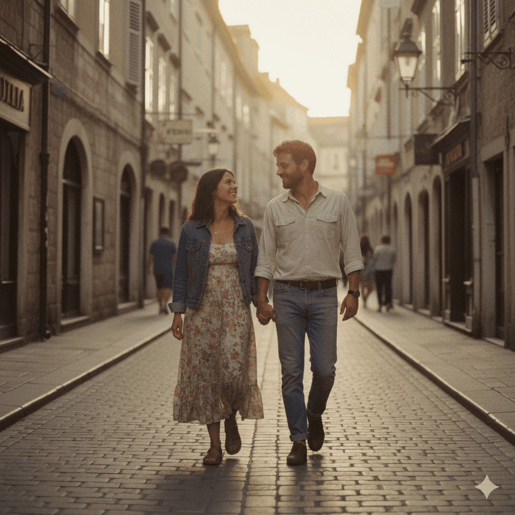 A romantic couple walking on an old-town street during golden hour, soft film grain, warm retro tones, subtle blur, 1980s cinematic look, natural candid expressions, vintage street mood.