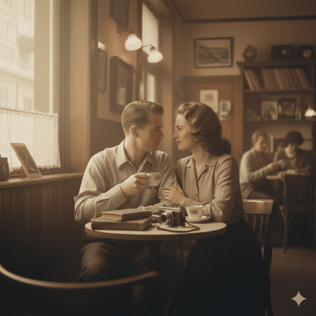 A couple sitting close inside a vintage café, wooden interiors, soft brown film tones, window light glow, grainy texture, emotional eye contact, timeless retro portrait aesthetic.