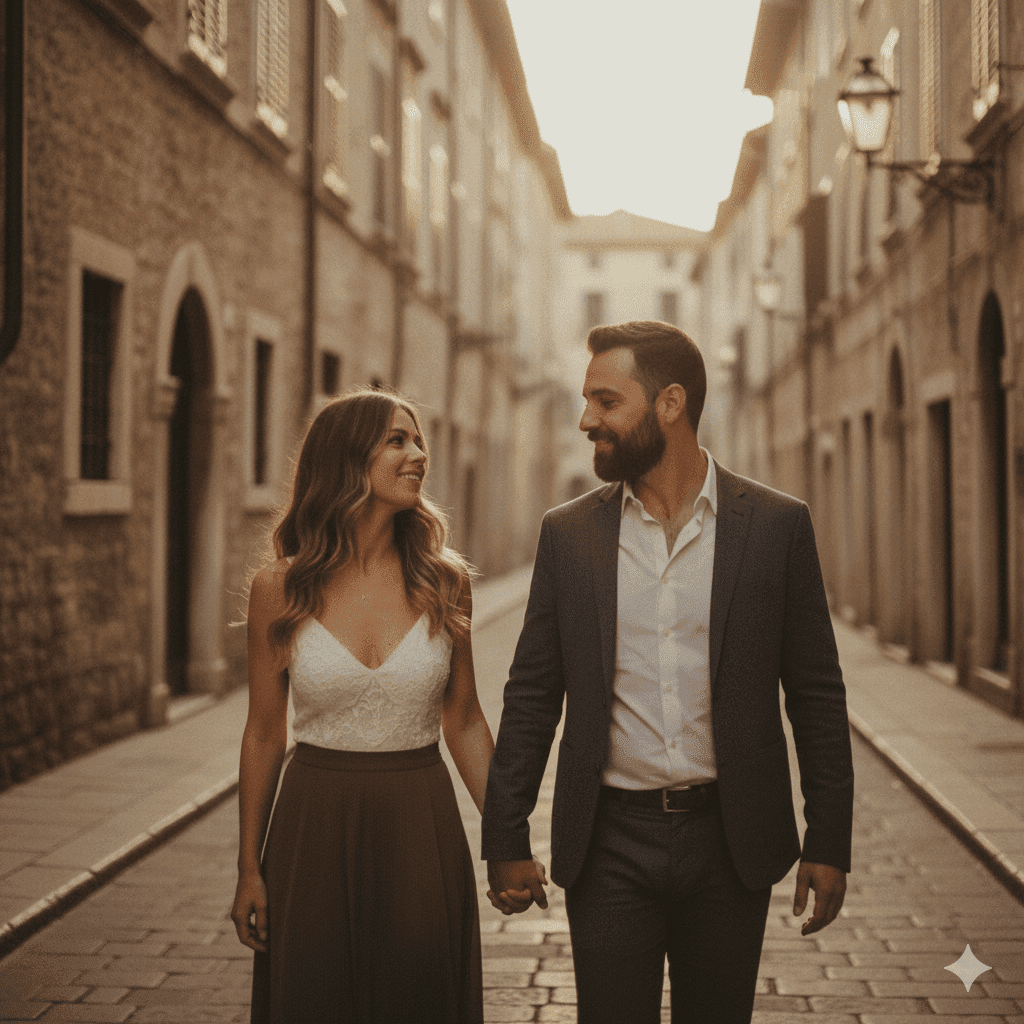 A romantic couple walking on a quiet old street during golden hour, soft warm glow on faces, subtle film grain, muted retro tones, slow-motion cinematic feel, natural emotional expressions, old-school romance aesthetic.