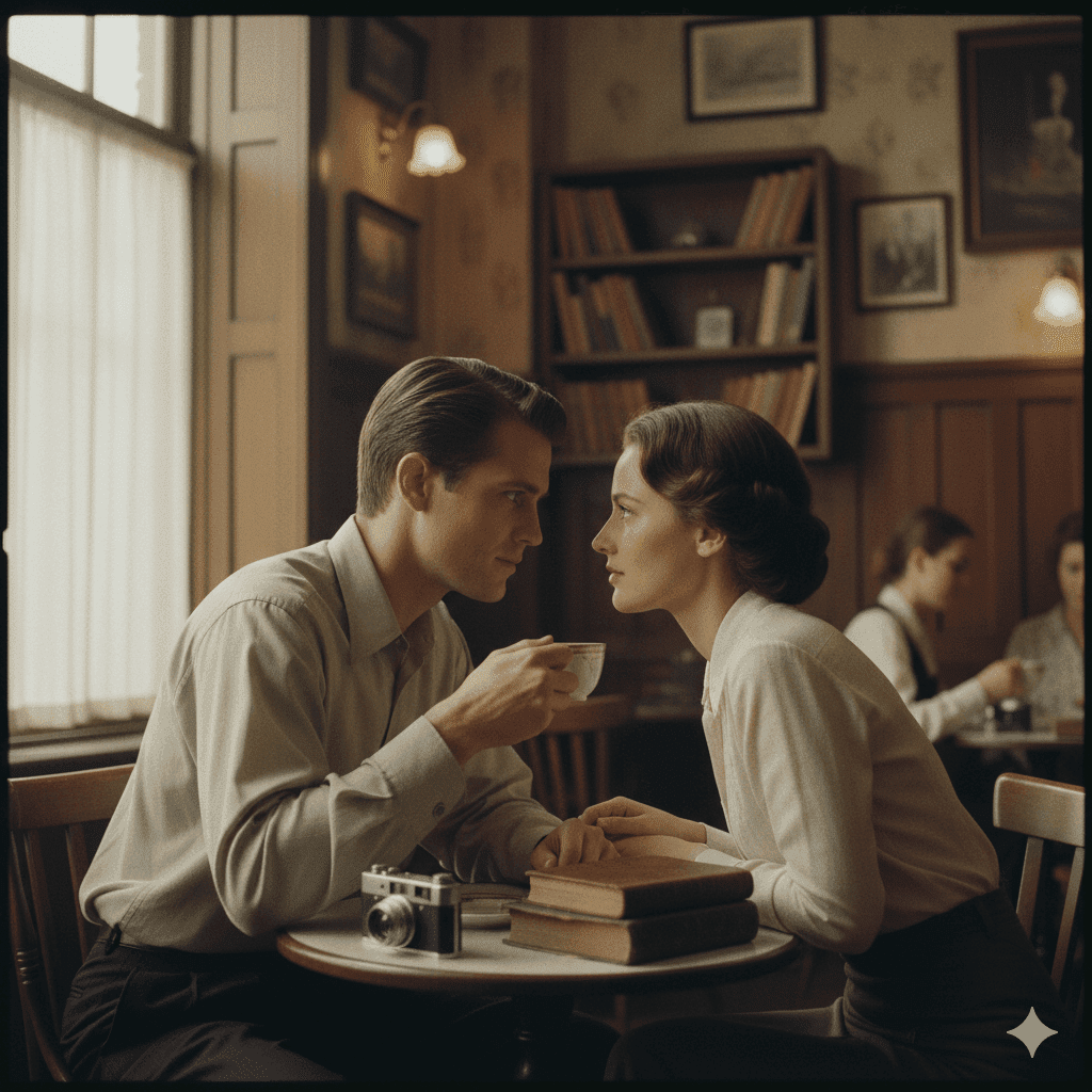 A couple sitting close inside a vintage café, wooden interiors, warm brown film tones, soft window light, grainy texture, emotional eye contact, classic old-school romantic mood, cinematic portrait framing.