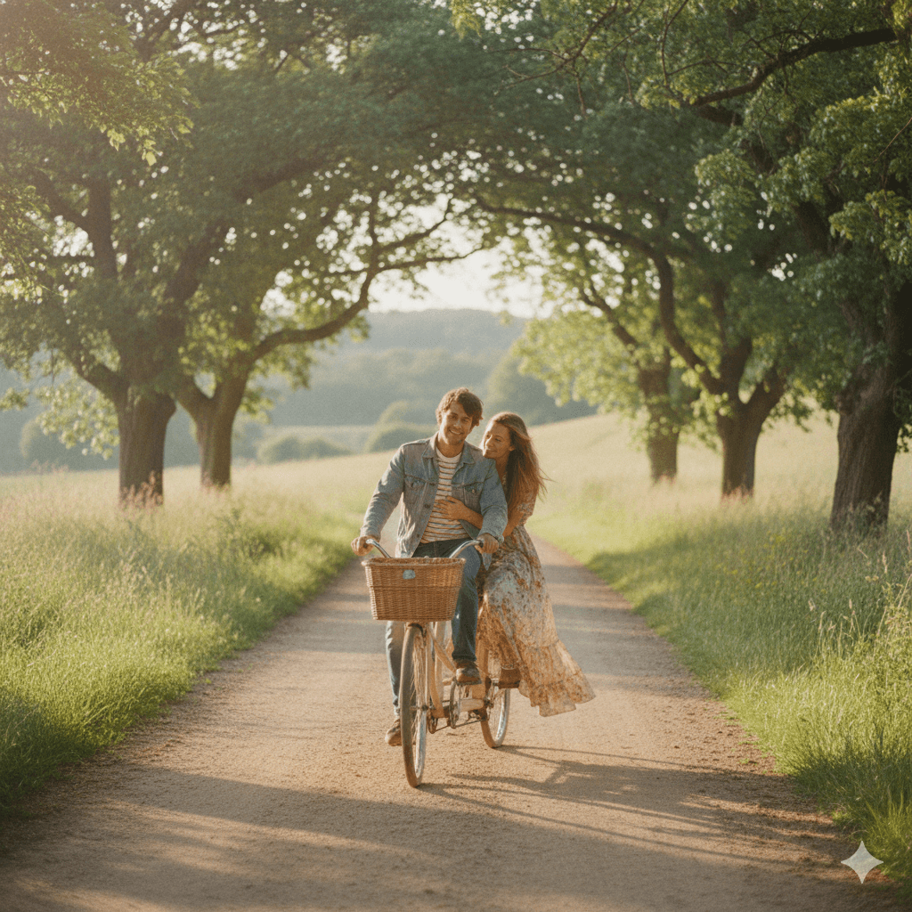 A couple riding a vintage bicycle through a countryside lane, pastel retro colors, soft grain, warm sunlight filtering through trees, dreamy romantic pose, 1970s film-inspired cinematic look.