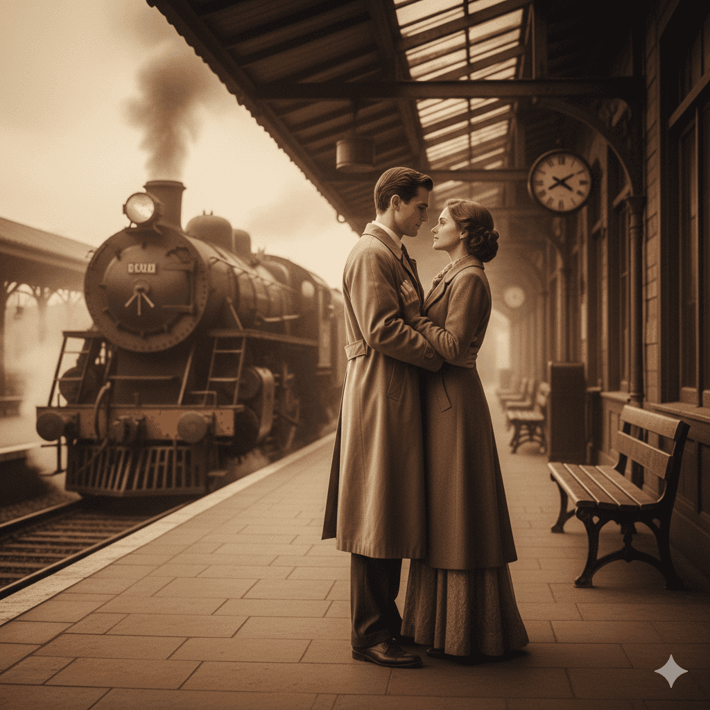 A couple standing at an old train station, soft vintage lighting, warm film saturation, subtle grain, emotional romantic pose, classic old-school cinema feel, deep nostalgic atmosphere.