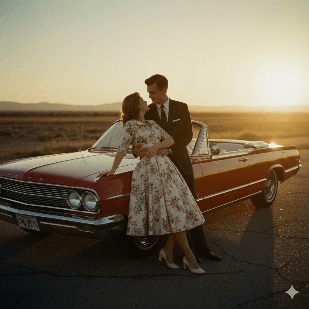 A couple leaning against a vintage car during sunset, golden film tones, soft shadows, detailed grain texture, nostalgic romantic pose, classic 1960s cinematic aesthetic, timeless retro love story vibe.